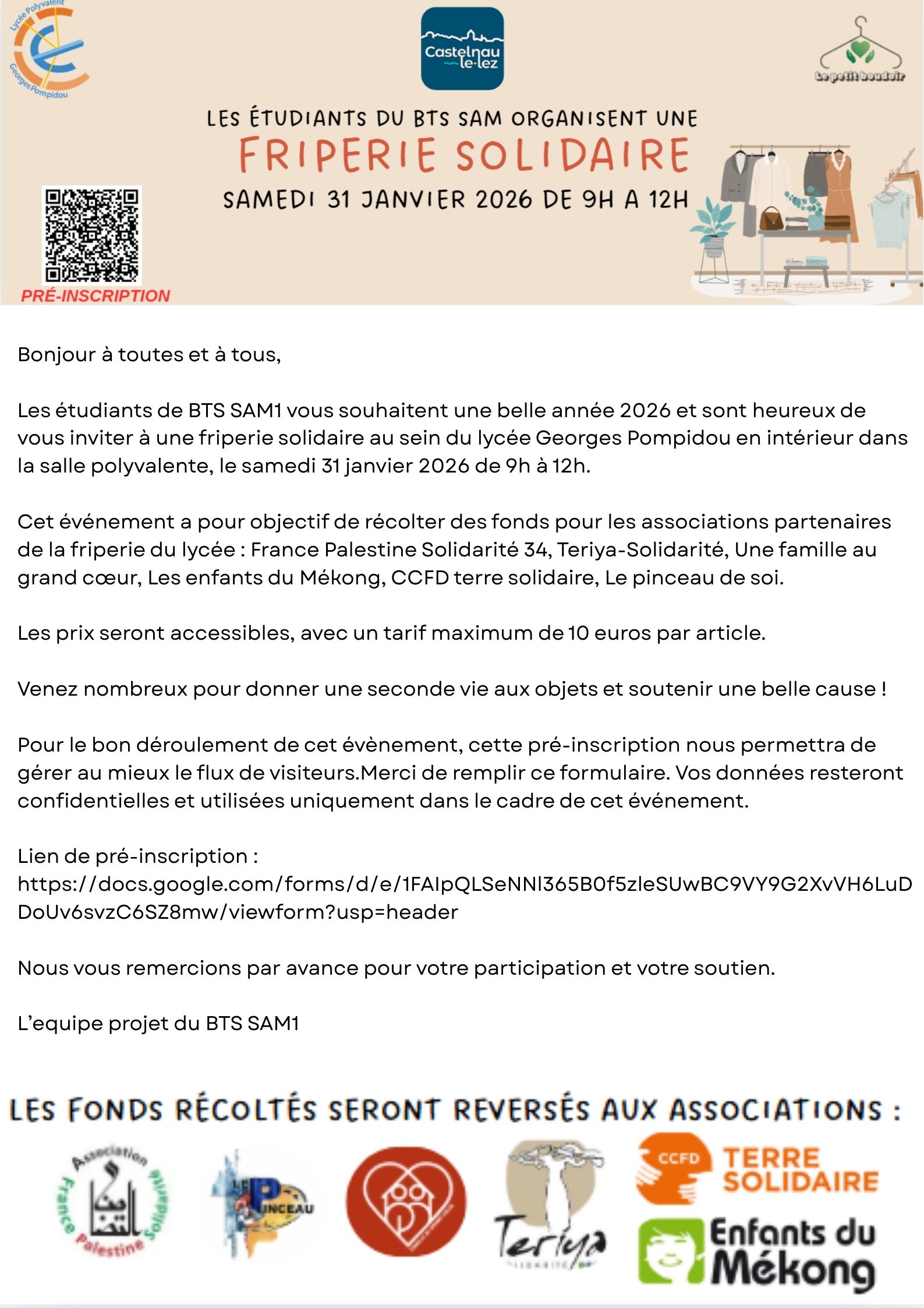 Les étudiants de BTS SAM1 vous souhaitent une belle année 2026 et sont heureux de vous inviter à une friperie solidaire au sein du lycée Georges Pompidou en intérieur dans la salle polyvalente, le samedi 31 janvier 2026 de 9h à 12h.